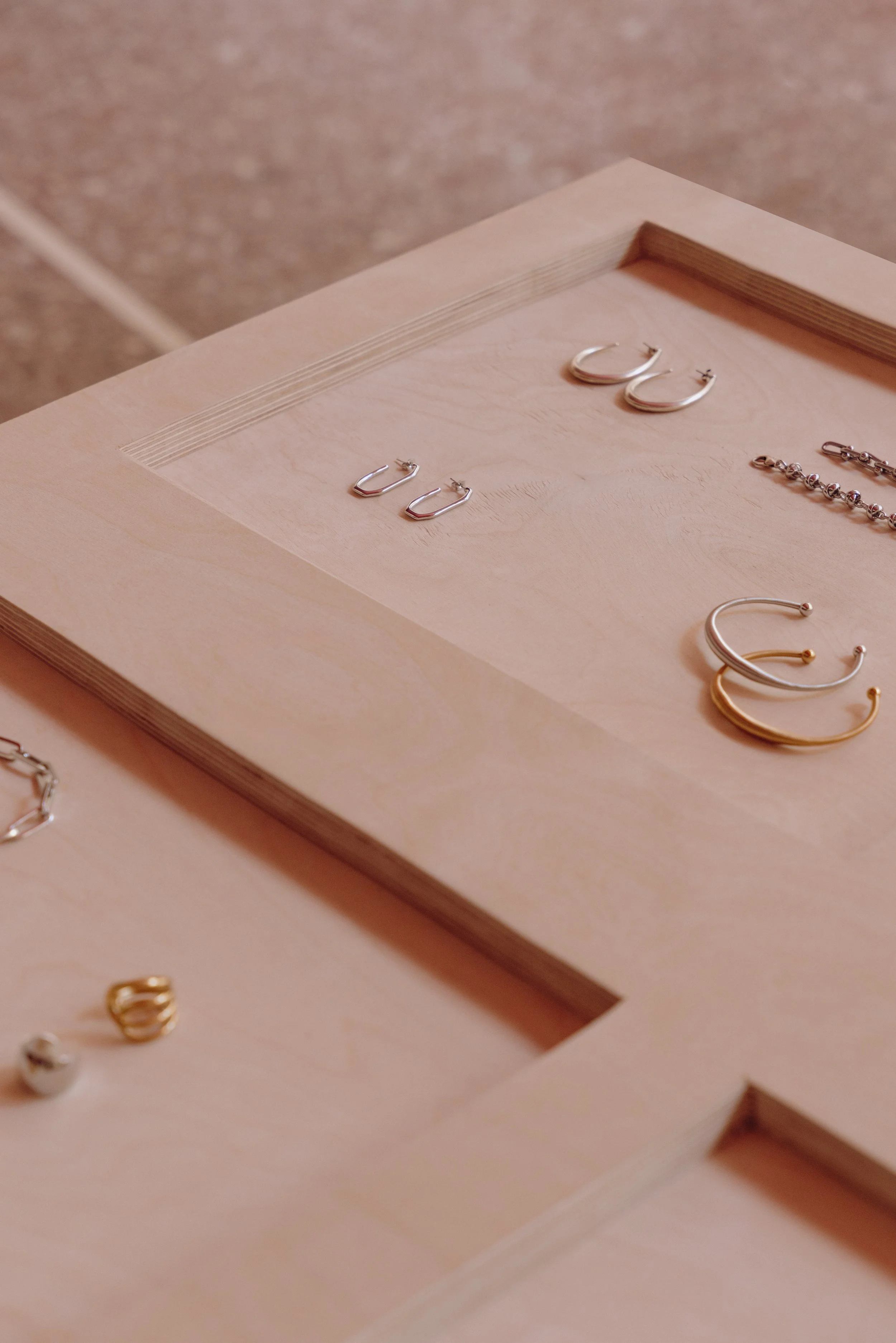 Custom furnishings follow a language of clarity and restraint, allowing the focus to remain on the products themselves. Jewelry display surfaces are designed with built-in recesses that discreetly frame each piece, offering a quiet yet deliberate moment of emphasis.