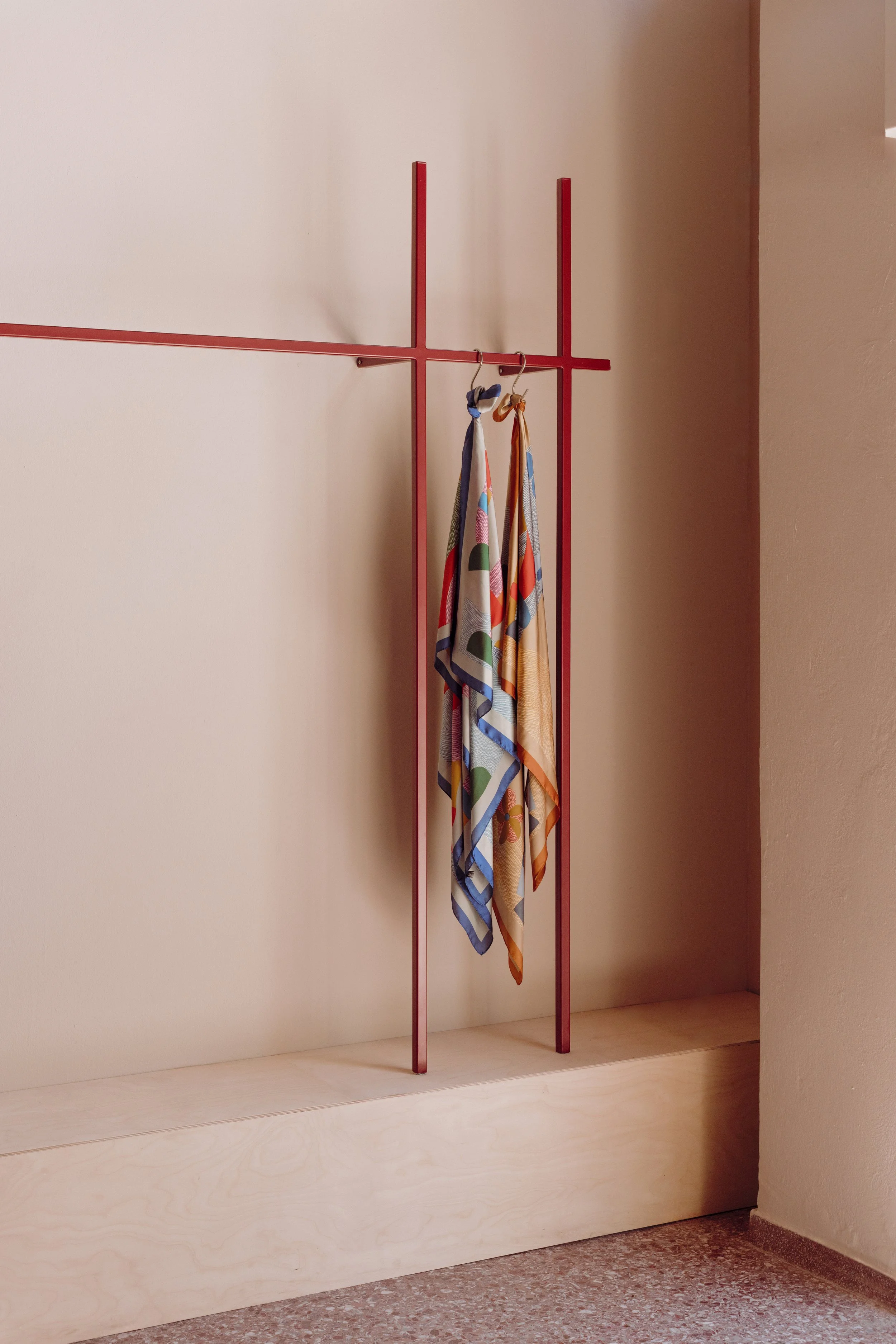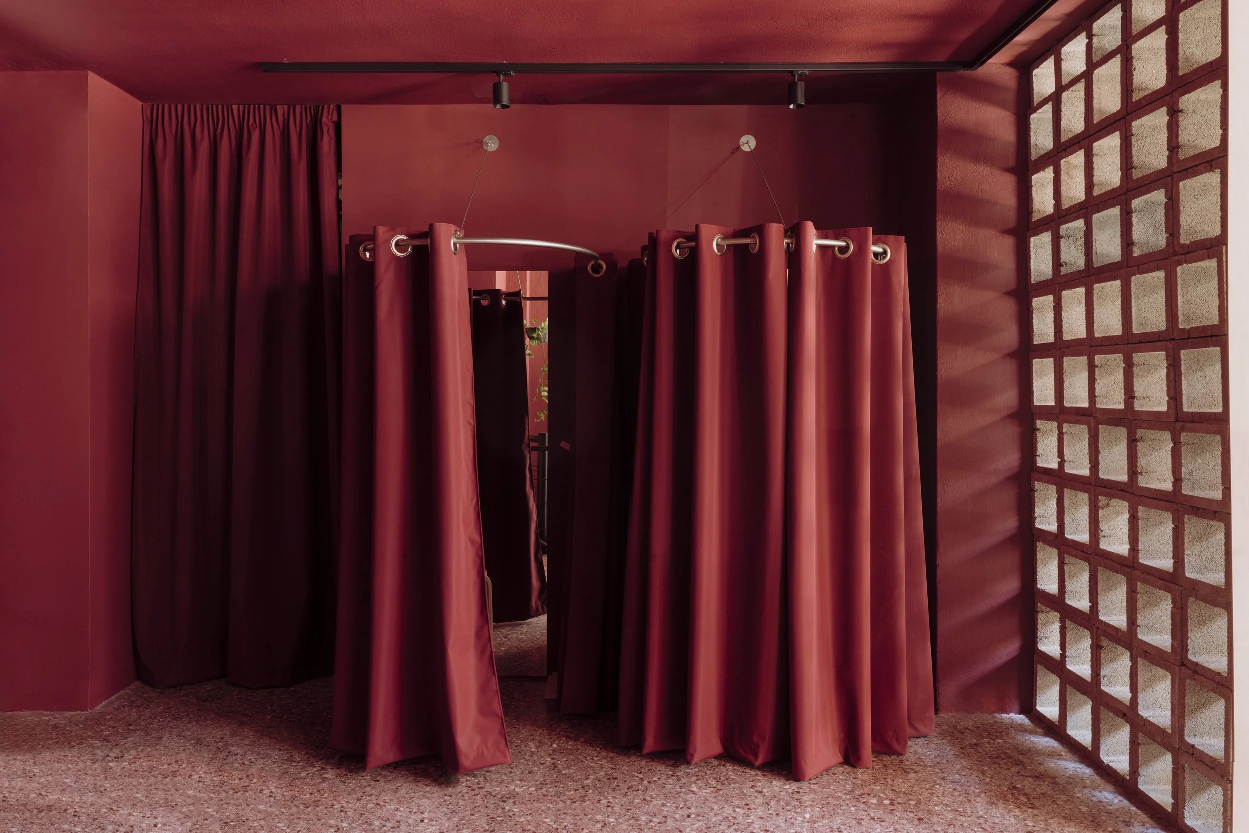 The design bridges past and present, revealing and respecting the material memory of the space without replicating its earlier forms. A two-tone wall treatment — with a warm beige at the base and a deep, muted burgundy above — softens the imposing vertical axis of the envelope, while creating a more human scale. This chromatic pairing also highlights the original mosaic flooring, which is preserved as an integral part of the space’s narrative.
