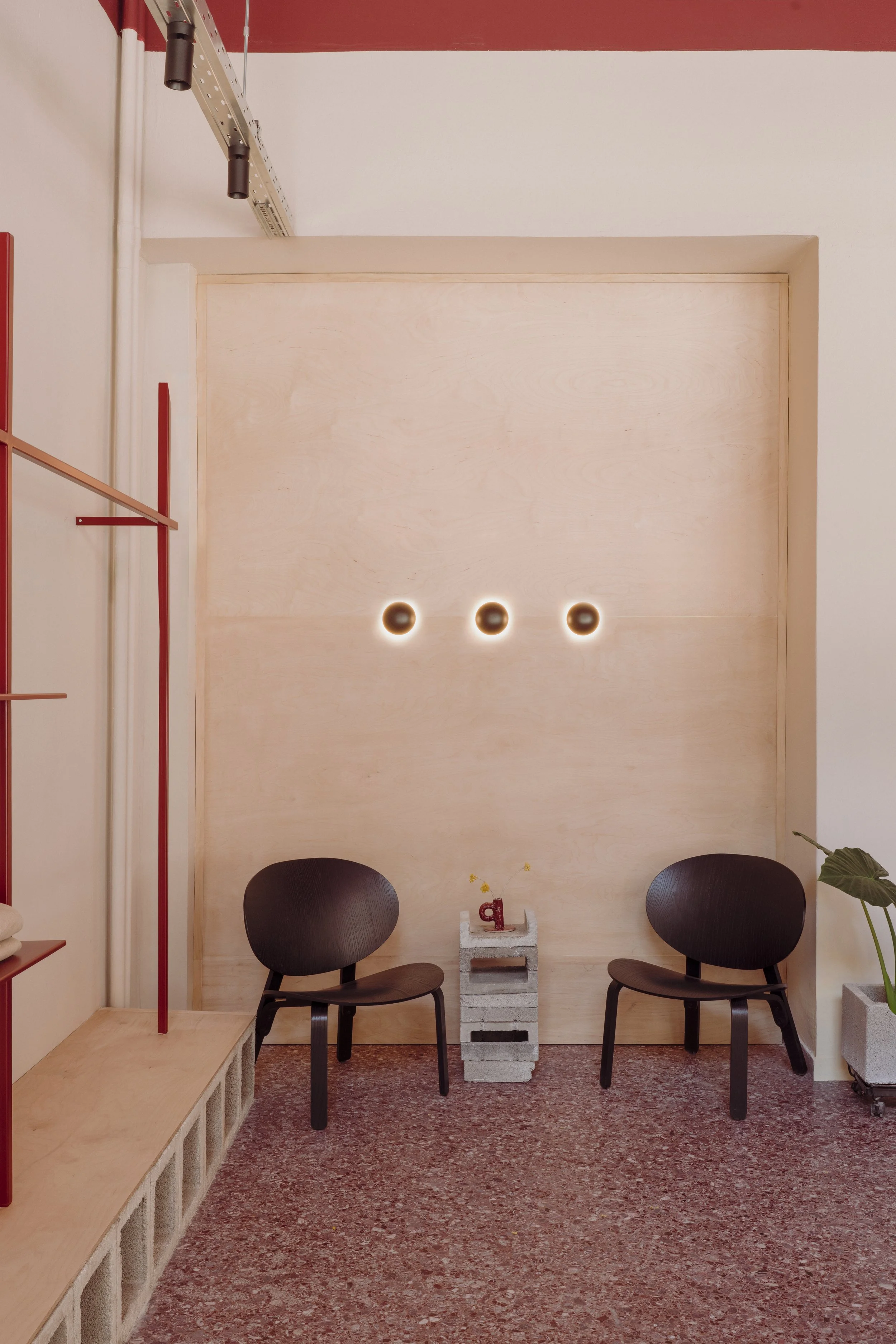 Natural wood adds warmth and material depth, reinforcing a sense of simplicity and comfort. Concrete blocks — a subtle reference to the site’s rougher, industrial past — are used creatively in both larger interventions, such as space dividers, and smaller elements like side tables and planters.